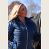 A steel blue velvet-lined insulated jacket for added warmth in the cooler months with printed raglan sleeves. Designed with a double stirrup zipper down the front and two push buttons on each side in the back for additional comfort when riding. The silver hardware complements the print pattern.